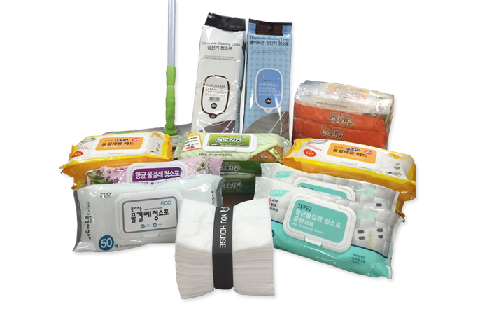 두꺼운 원단을 크게 제단하여, 청소용으로 특화된 물티슈를 제작 및 공급합니다.